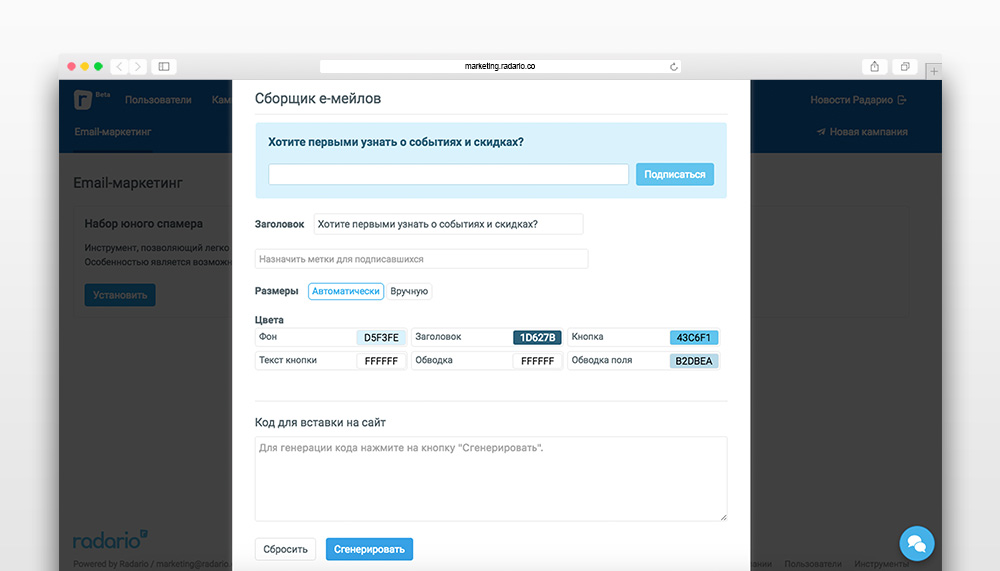 уже писали в нашем блоге на примере театральной сферы. Если вы никогда этим не занимались, то начать собирать базу нужно двумя способами. Во-первых, продавая билеты онлайн на своем сайте, в своих социальных сетях и в кассе (при этом система, которую вы используете для продажи, должна предоставлять вам email-адреса, которые оставляет зритель при покупке). Кроме того, нужно установить на свой официальный сайт сборщик email-ов. С использованием маркетинговой платформы Radario это происходит примерно так: вы кастомизируете форму для сбора адресов (выбираете цвет, вводите заголовок, задаете размеры), получаете код для вставки на сайт и добавляете его в нужное место – самостоятельно или с помощью администратора вашего ресурса.